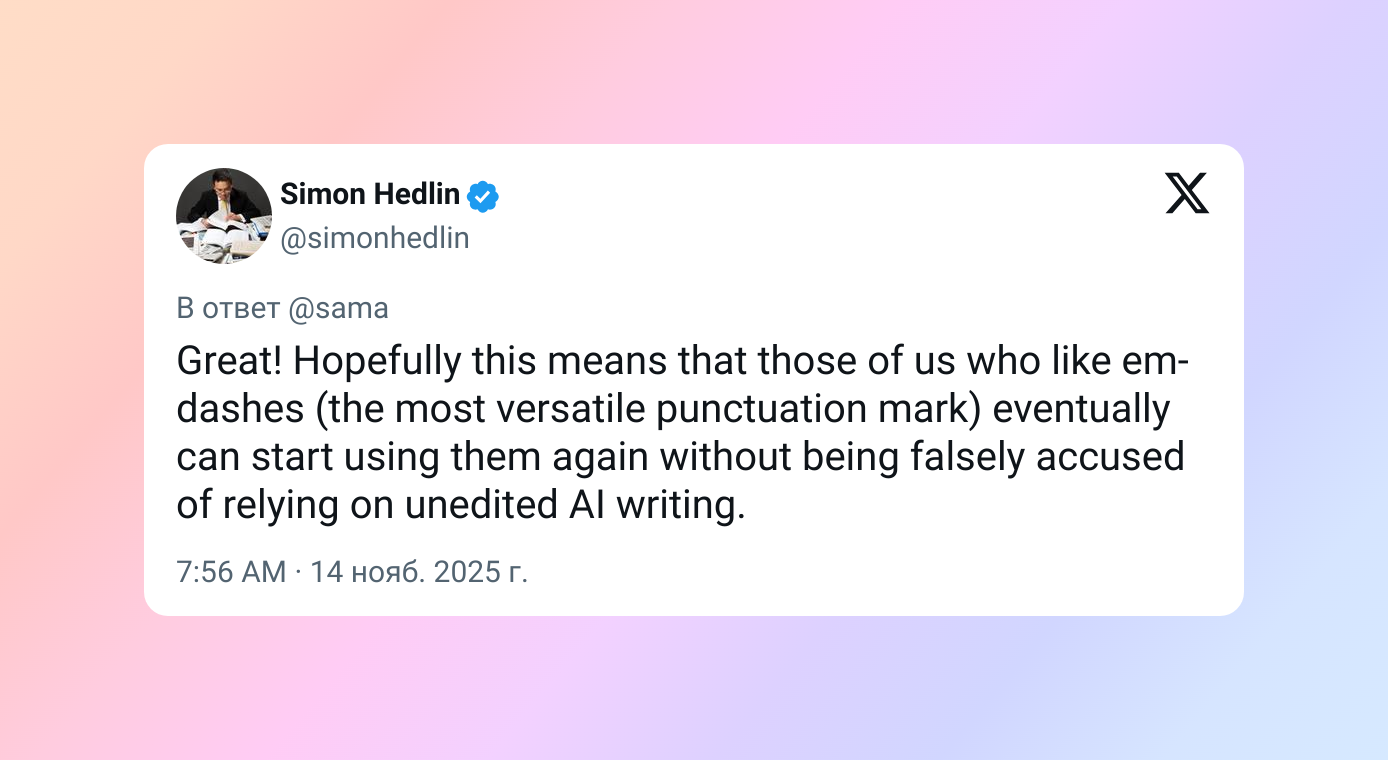 ChatGPT наконец-то научился избегать длинных тире по требованию пользователя. Об этом рассказал генеральный директор компании Сэм Альтман, назвав это «небольшой, но приятной победой».Чтобы ChatGPT перестал везде ставить длинные тире, нужно прописать соответствующие указания в пользовательских инструкциях в настройках. Если просто попросить нейросеть не использовать знак препинания в окне чата, то это не сработает.Проблема с навязчивым использованием чат-ботом длинного тире обсуждалась давно. Многие говорили, что наличие символа в тексте сразу наводит на мысли о том, что автор использовал нейросеть. Другие же подчёркивали, что этот знак препинания был популярен в литературе задолго до появления ИИ, а частота его использования моделью объясняется тем, что она училась на реальных человеческих текстах.В комментариях под публикацией Альтмана пользователи встретили новость по-разному. Некоторые искренне обрадовались.