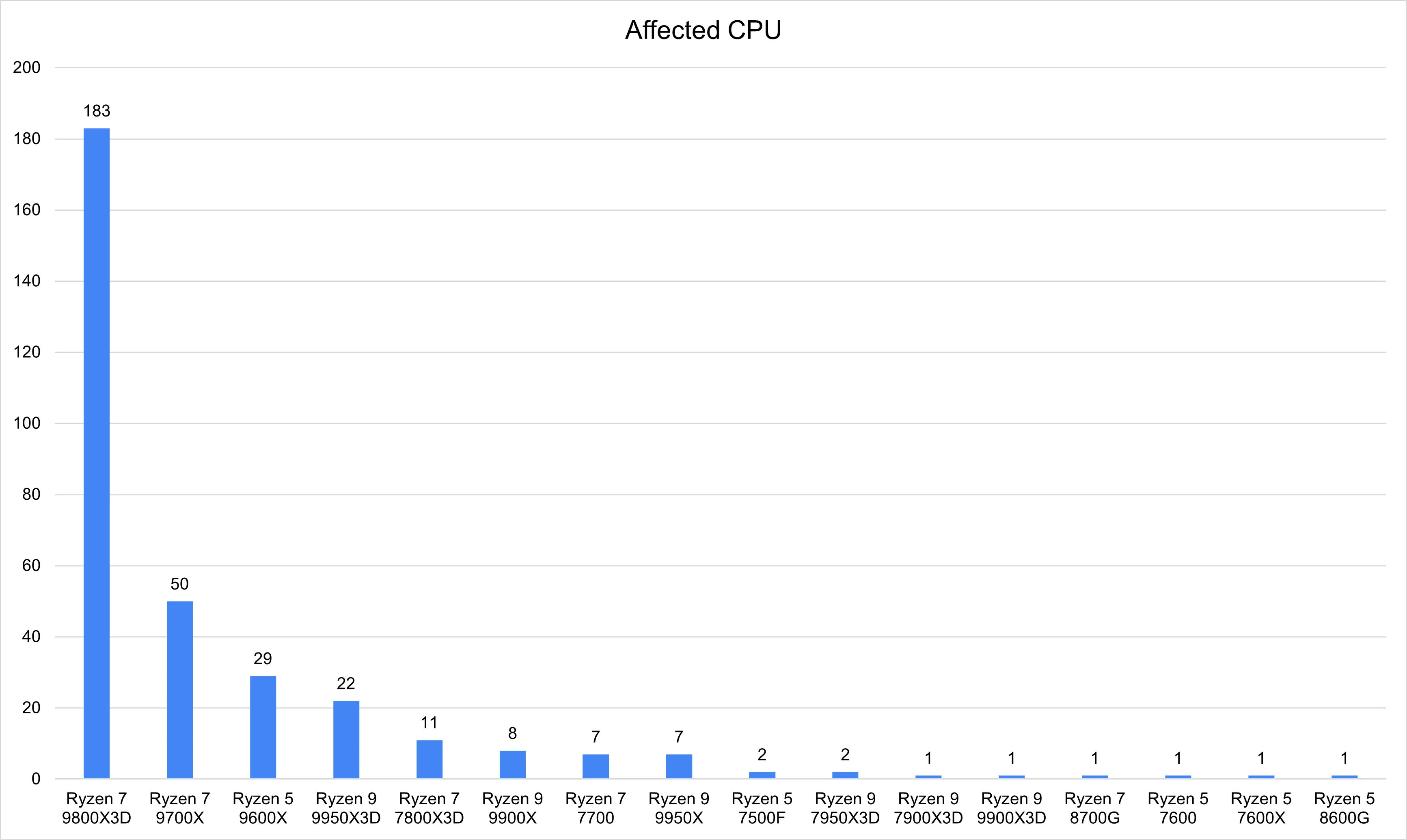 Пользователи Reddit в декабре собрали статистику выхода из строя различных моделей процессоров на материнских платах ASRock. На тот момент было известно о 183 подтверждённых случаях выхода из строя процессоров Ryzen 7 9800X3D, 50 случаях с процессорами Ryzen 7 9700X и 29 — с чипами Ryzen 5 9600X, а также о 22 случаях с моделями Ryzen 9 9950X3D. В эту статистику не были включены последние инциденты, произошедшие в январе.