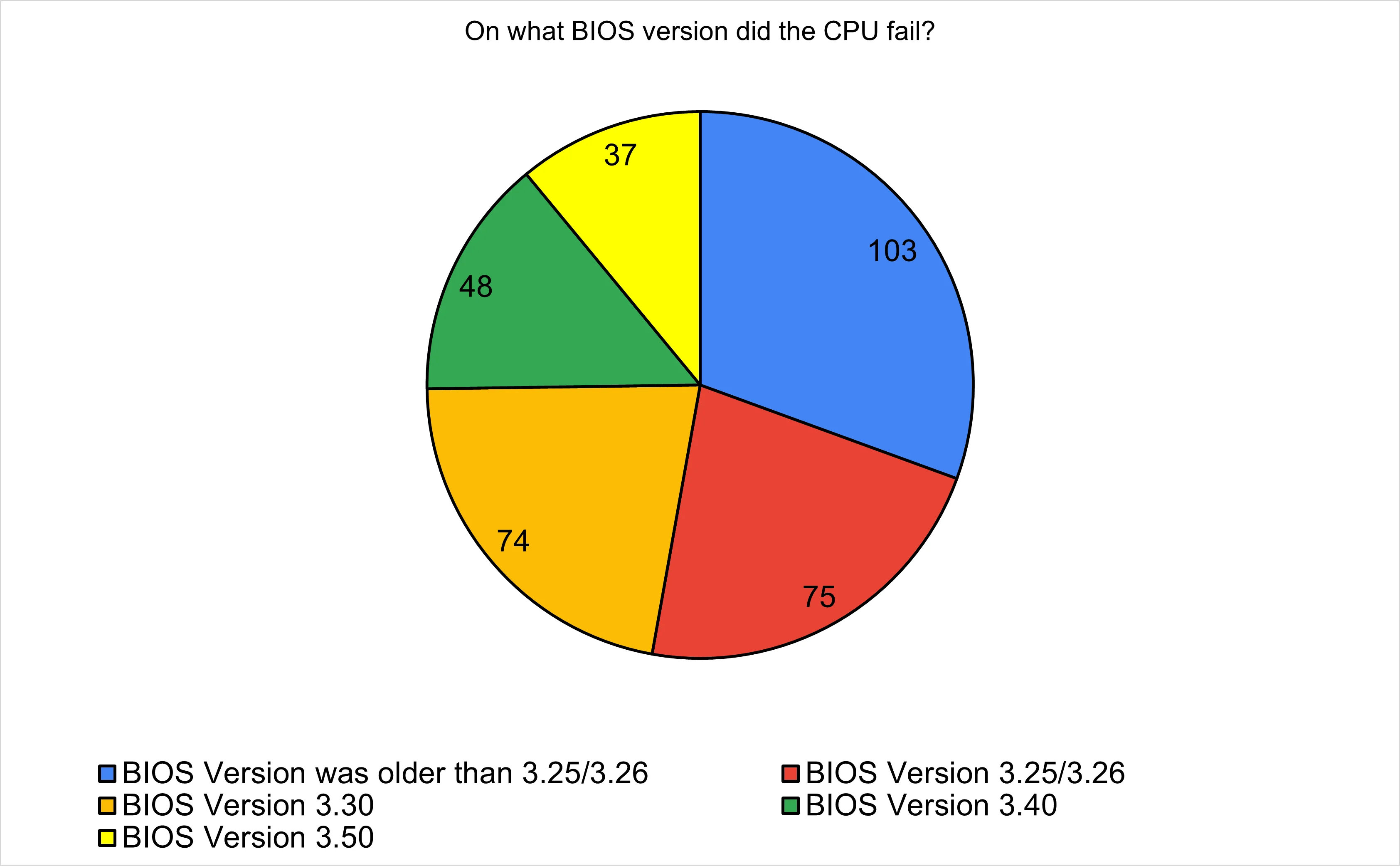 В той же ветке форума была опубликована статистика версий BIOS плат на момент выхода из строя процессоров. Похоже, что ни одна версия прошивки не защищает от возможной поломки чипов Ryzen 9000 на платах ASRock. Чаще всего поломки происходят на платах с версиями BIOS «старее 3.25/3.26» (103 зафиксированных случая, или 31 % от общего количества); на версии BIOS 3.25/3.26 зафиксировано 75 выходов из строя процессоров AMD (22 % случаев); на версии BIOS 3.30 — 74 случая (22 % от общего числа); на BIOS 3.40 — 48 случаев (14 % от общего количества). На версии BIOS 3.50 было зафиксировано 37 случаев, или 11 % от общего количества.