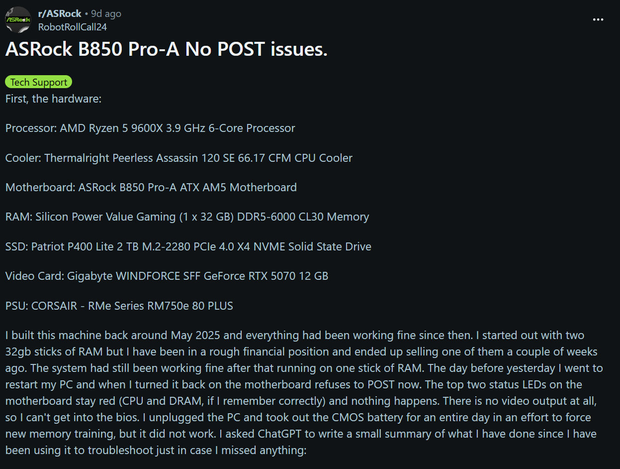 Один из пользователей описывает два последовательных сбоя Ryzen 5 9600X на одной и той же платформе (плата ASRock B850M Pro-A WiFi). Первый случай произошёл в октябре прошлого года. Пользователь заменил процессор по гарантии, однако второй чип также вышел из строя.